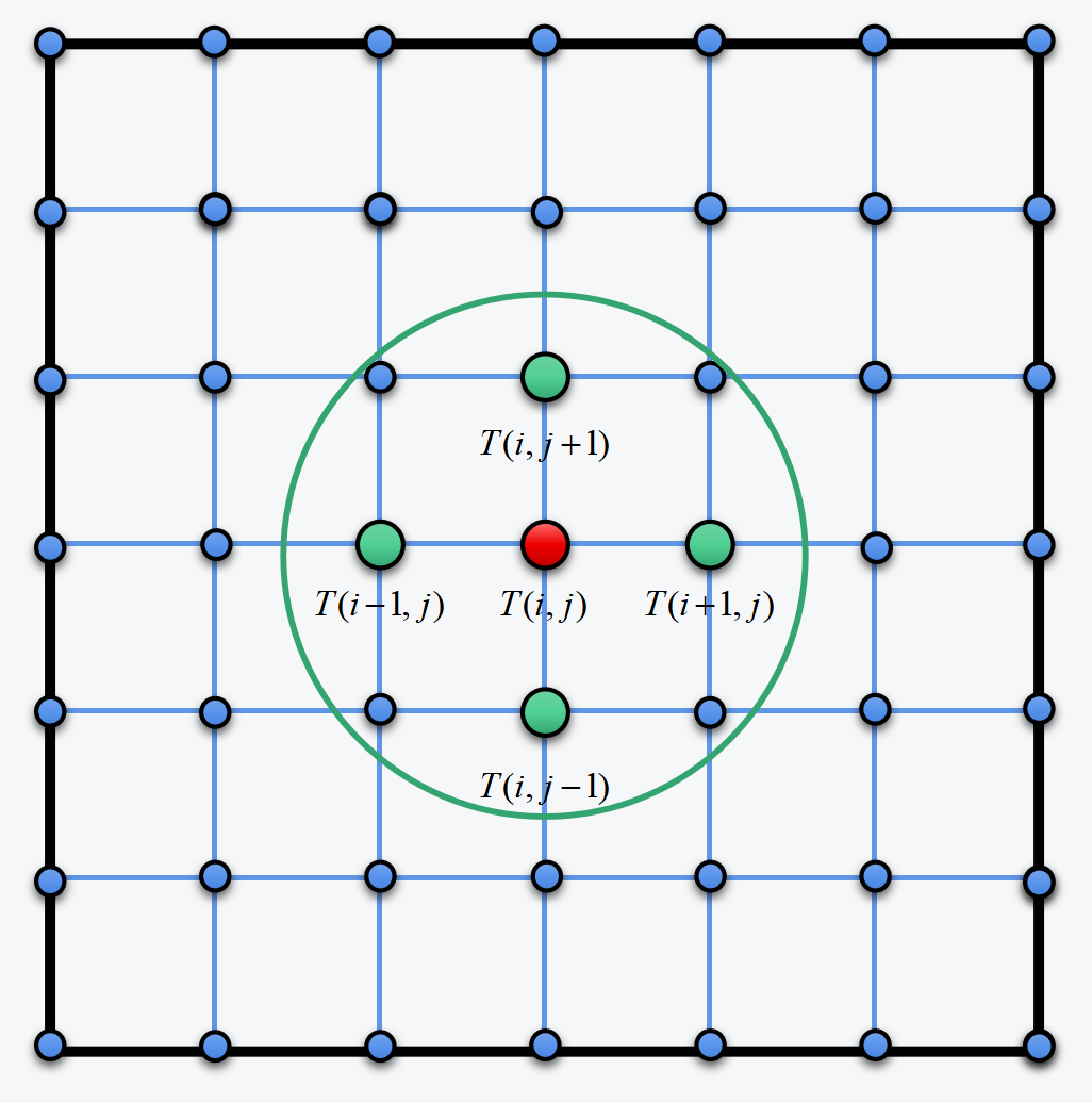 To visualize the phenomenon on a computer, we need to have temperature grids. The grid is used for the discretization of the whole 2D plane. Five-point stencil difference is the method we use to express derivation for the heat partial differential equations. The corresponding temperature grid with a Five-point stencil can be seen in the picture shown below: